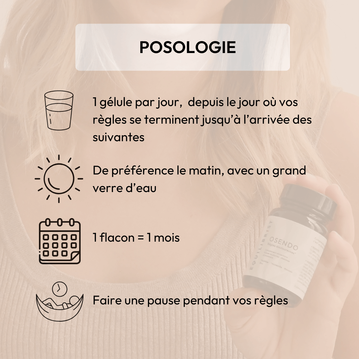 Débutez votre cure depuis le jour où vos règles se terminent jusqu'à l'arrivée des règles suivantes. Faire une pause pendant les règles. 1 gél/jour le matin.